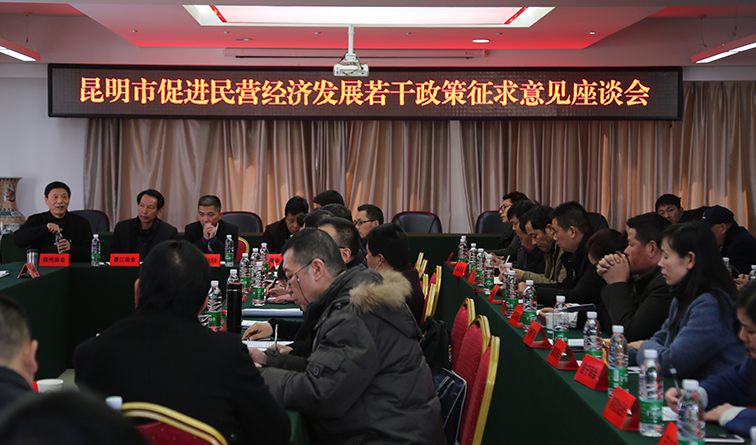 受昆明市人民政府市长王喜良,市委常委、统战部部长杨皕委托,昆明市工商联、市工信委于2月1日下午在市级行政中心召开“昆明市促进民营经济发展若干政策征求意见座谈会”。市委统战部副部长、市工商联党组书记蔡永福,市工商联副主席訾贵金、范莉华,市工信委总工程师阳书文出席会议,我会负责人应邀参加座谈。