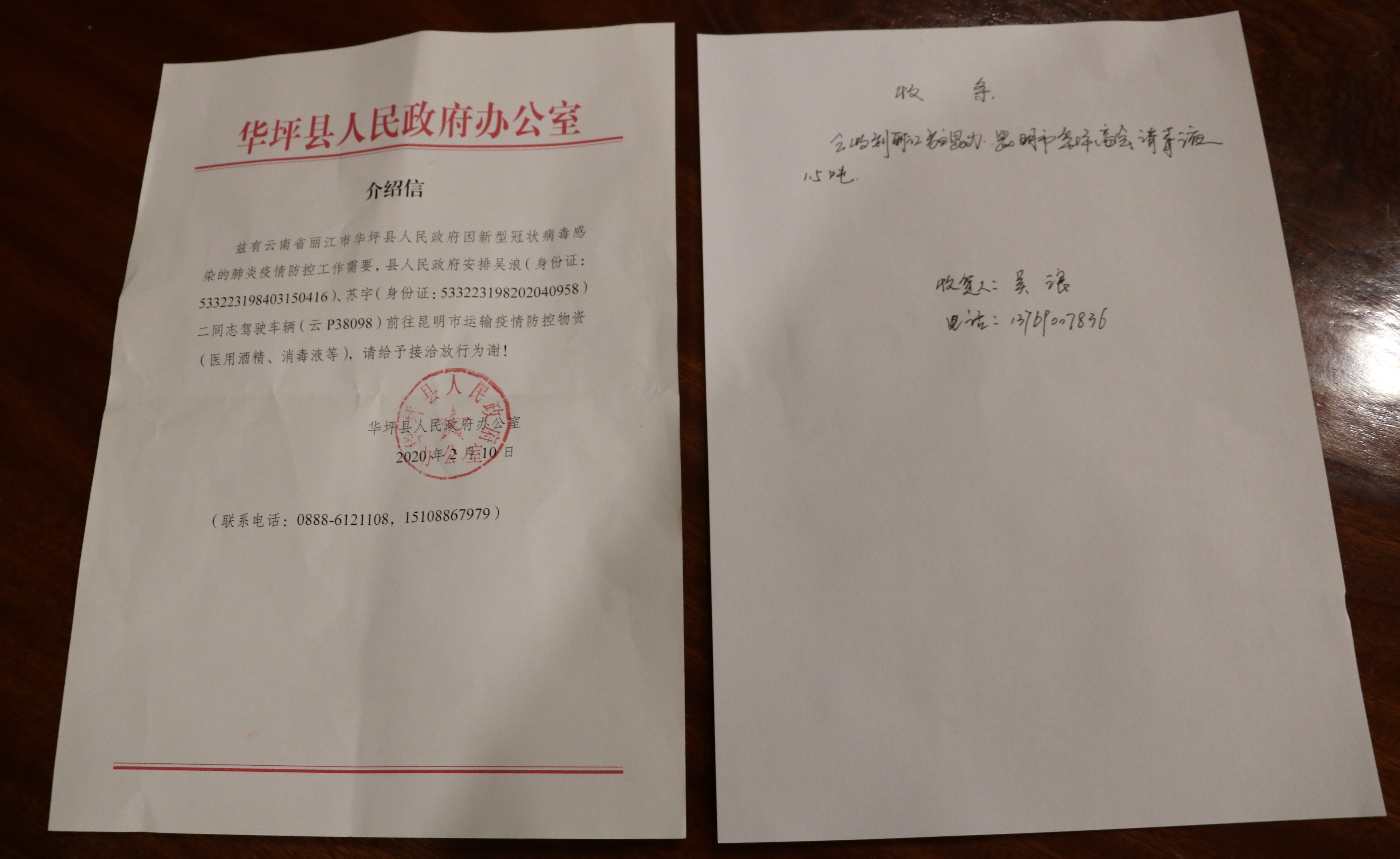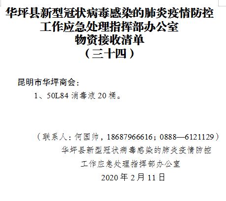 考虑到医用物资的特殊性,华坪县人民政府决定指派中国邮政“专车”运送该批物资。邮政专车于2月10日深夜到达商会,商会相关成员连夜加班加点,配合工作人员将防控物资清点装车。礼轻情意重,载着全体商会成员浓浓家乡情谊的邮政专车凌晨时分从昆明出发,于2月11日清晨顺利到达华坪县新型冠状病毒感染的肺炎疫情防控工作应急处理指挥部 。